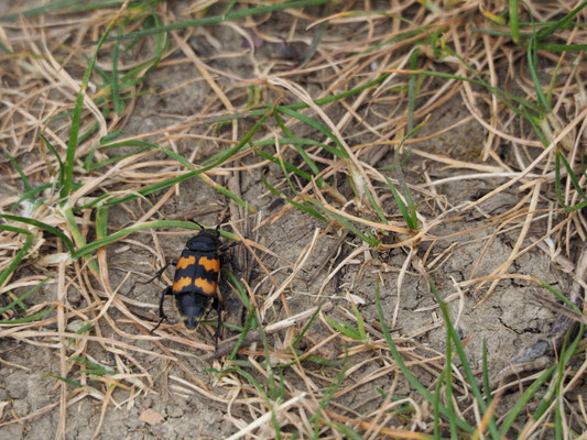 Tot slot stak een heuse Krompootdoodgraver, het bleek – na raadpleging van de ANWB natuurgids - niet de gewone doodgraver te zijn, voor onze voeten de weg over. Als je goed kijkt zie je namelijk zijn oranje sprietknotsen. De gewone moet het helaas doen met zwarte knotsen. De natuur is hard. Onze krompoot moest natuurlijk ook op de foto. Zo ook de paardenbloemen en de mooie lucht.